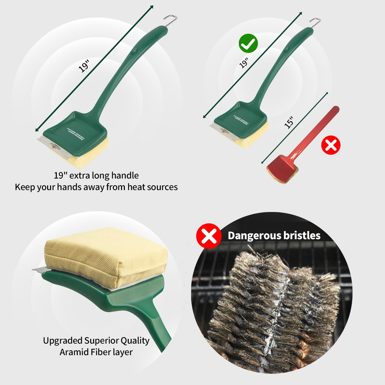 The long ergonomic handle provides a safe distance from heat, while the sponge ensures gentle cleaning without scratching surfaces. Ideal for gas grills, charcoal grills, and smokers.