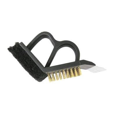 Built for tough cleaning, this heavy-duty hand grill brush features strong stainless steel bristles and a scraper for removing stubborn burnt residue.