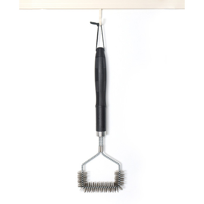 This long-handle grill brush features a convenient hanging hook for easy storage. Equipped with durable steel bristles and a scraper, it ensures effective cleaning while keeping your grill in top condition.